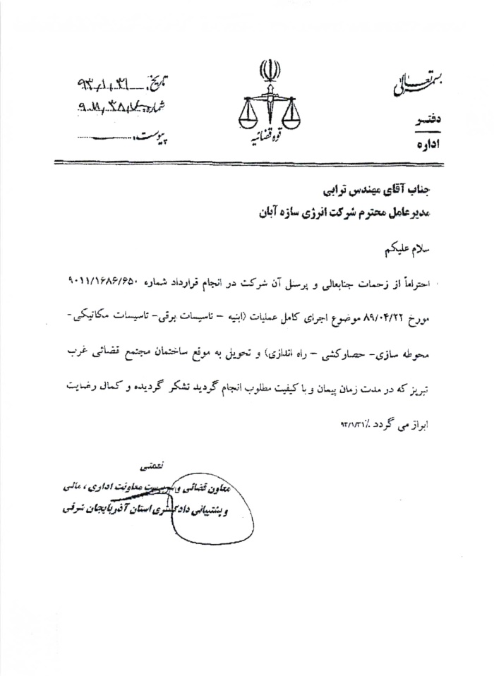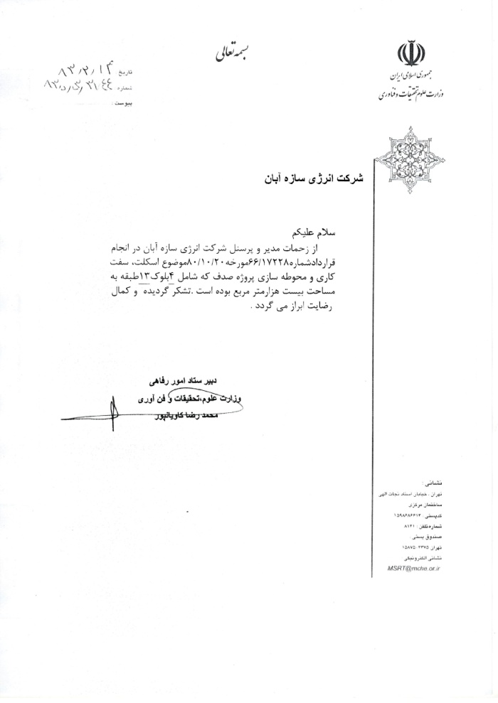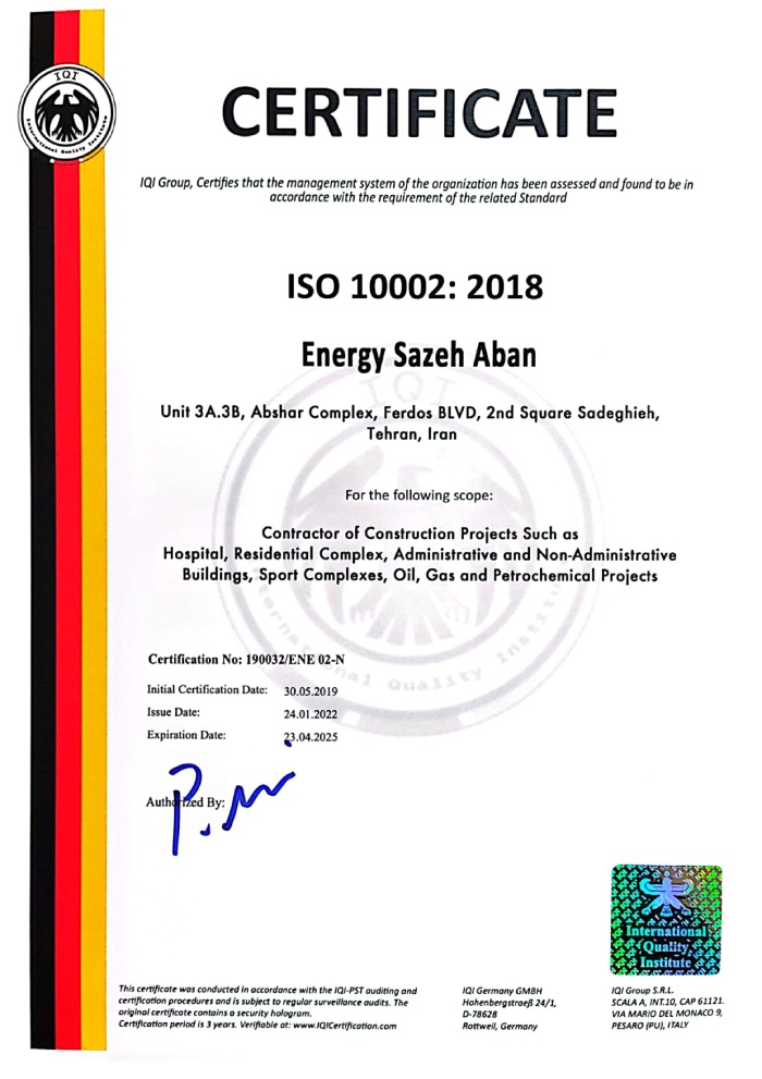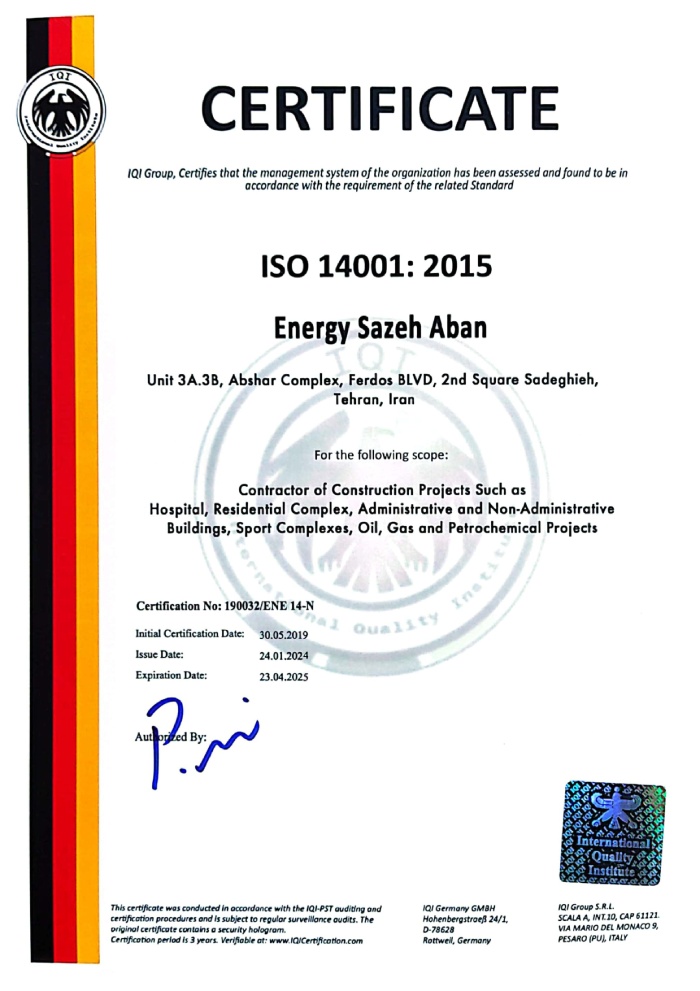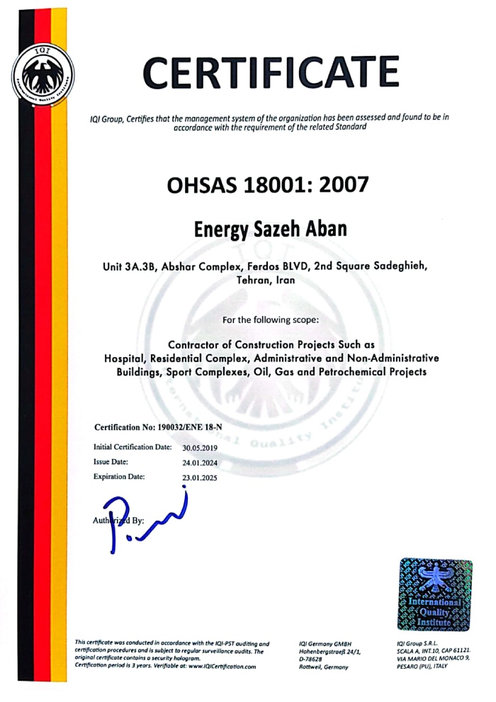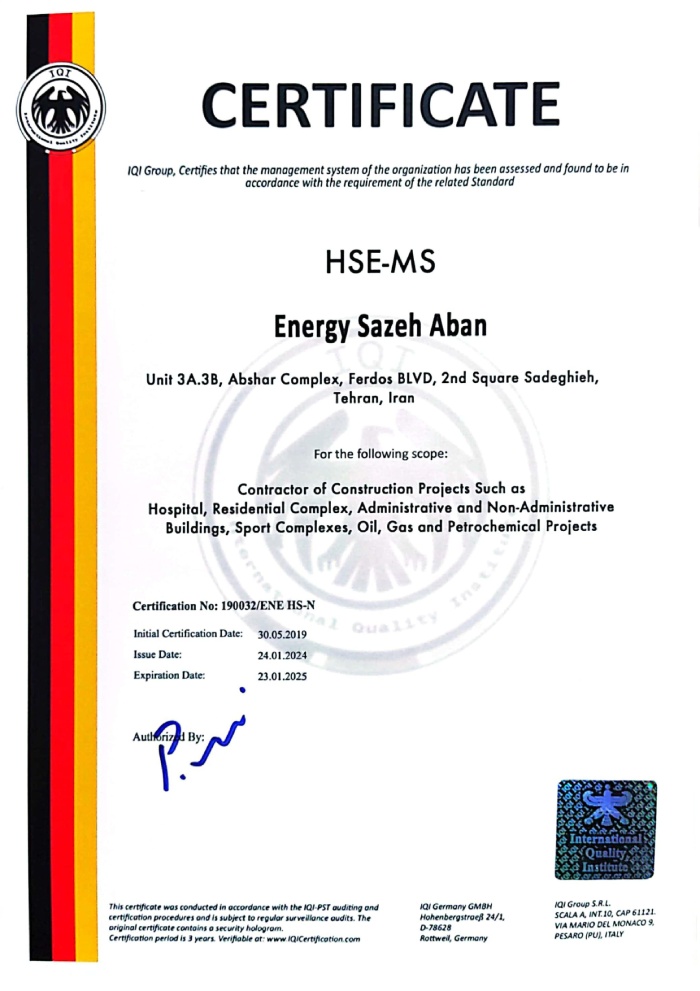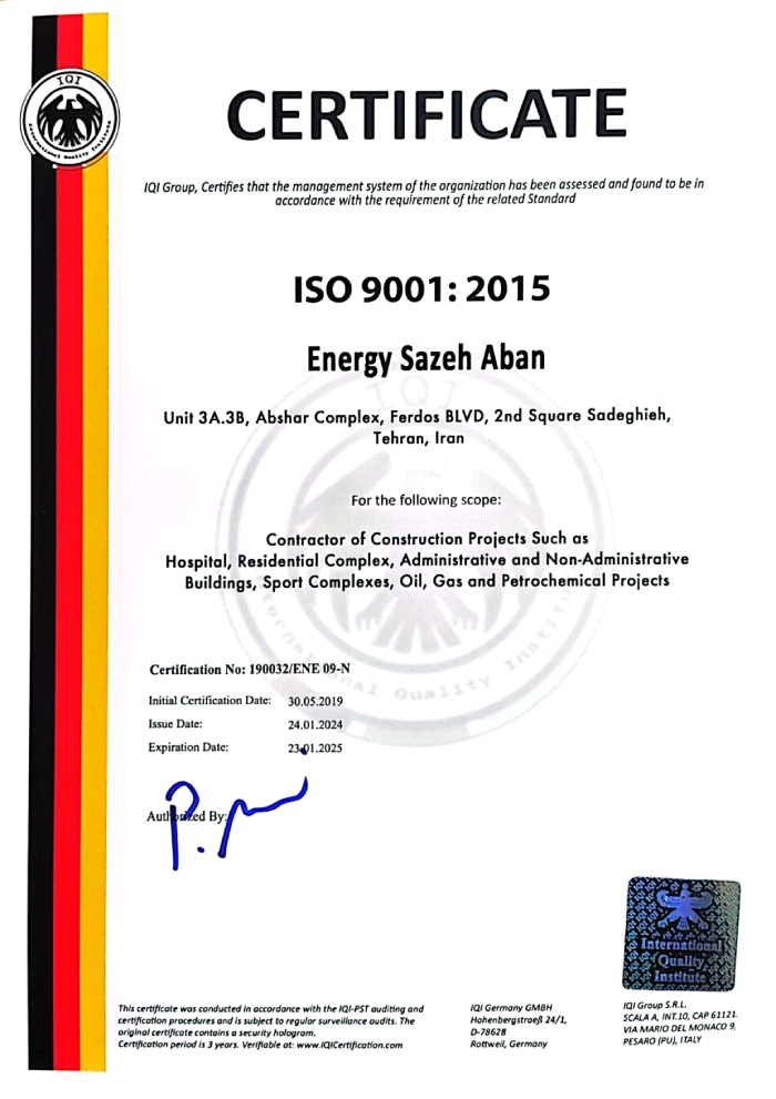 The company holds a Grade 1 ranking in Buildings, Grade 1 in Installations and Equipment, Grade 3 in Water, and Grade 3 in Roads and Transportation. With over 160 skilled professionals based at our headquarters and on project sites across the country, Energy Sazeh Aban has emerged as one of the leading construction companies in Iran.